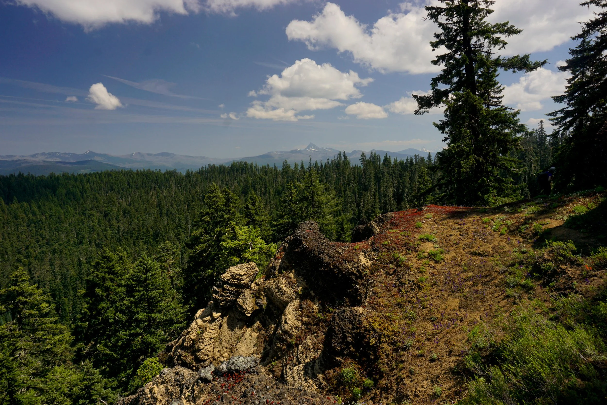 The trail then climbs above this meadow amid fabulous June and July displays of larkspur and mariposa lilies to a spectacular ridge end, where views stretch south to the Three Sisters (and behind you, Mount Jefferson). Continue on this trail, passing in and out of meadows, to a junction with the Bachelor Mountain Trail in deep woods at 2.9 miles from the trailhead. Looking behind you, note the old Bruno Meadows Trail sign high up on the tree! Turn right here and climb 0.6 mile through the woods to the rocky summit of Bachelor Mountain at 5,943 feet. The view here is magnificent, covering the entirety of the Old Cascades and much of the high Cascades from Mount Hood to the Three Sisters and beyond. A lookout once stood here, as evidenced by the bent metal and broken glass strewn about the summit. Although this is a popular destination, you should be able to find an isolated corner to spread out for lunch.