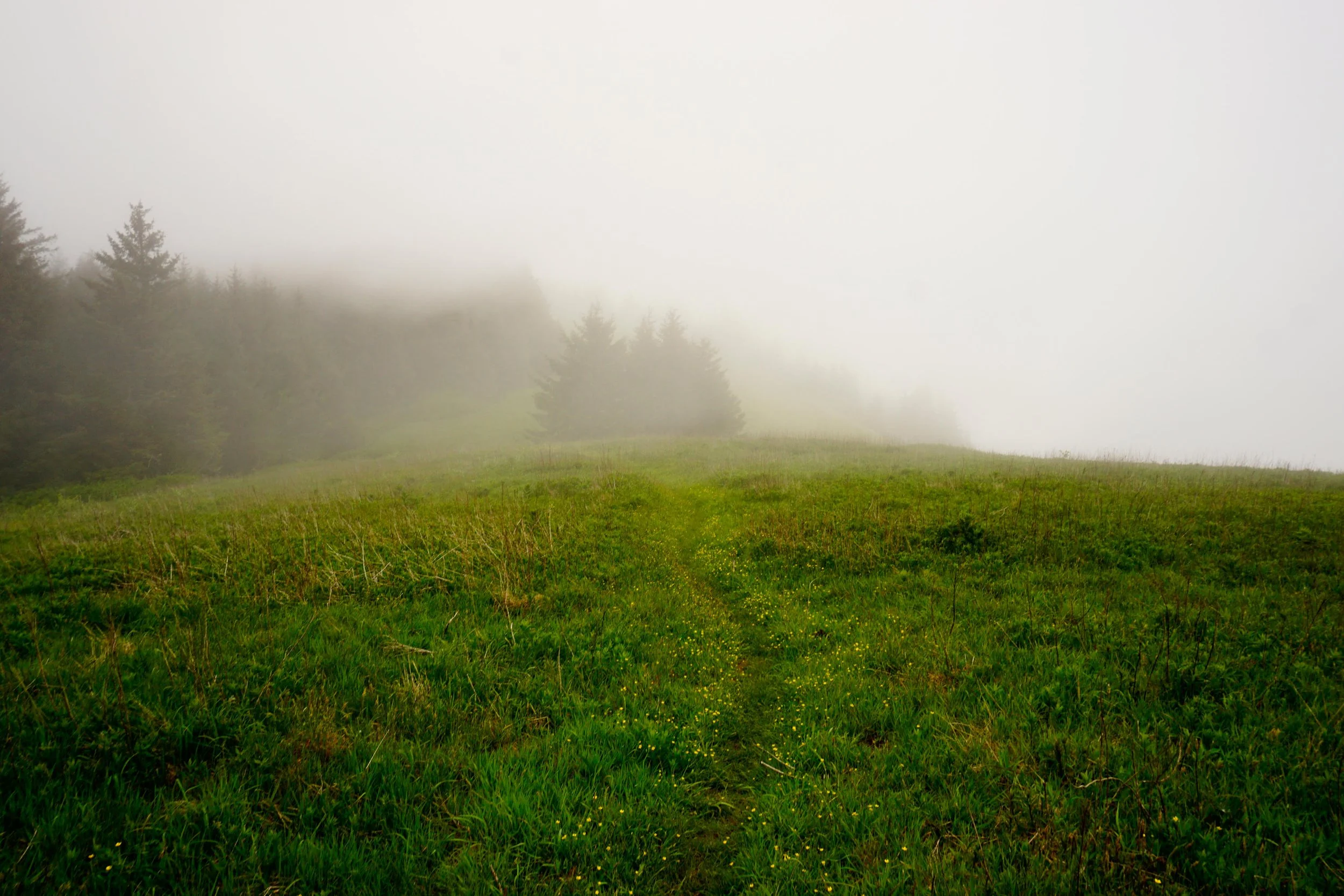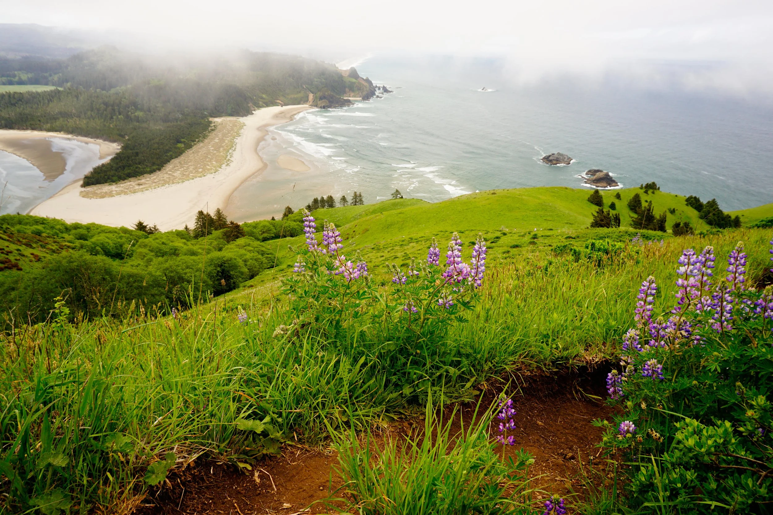 The trail, now fully away from the road, climbs into a magical forest of huge Sitka spruce trees, which only grow to this size close to the ocean. Everything appears green and verdant. The trail continues to climb uphill and begins to angle west towards the hanging meadows of Cascade Head. The trail crosses a few side creeks and eventually trades forest for meadows at about 1.3 miles from the trailhead. Every step from this point on brings you better and better views as you ascend the open slopes of Cascade Head. Be sure to stay on the main trail here, as volunteers have diligently closed all user-built side trails. Besides, the side trails don’t go anywhere - and in fact, there are cliffs everywhere here, so there’s no point in putting yourself in a bad situation just for curiosity’s sake. As you hike uphill, your eyes will no doubt be drawn back to the south, towards the beaches and cliffs of Three Rocks. On a sunny day this is one of the Oregon Coast’s most iconic views. The trail reaches the summit at 2.4 miles, where a post marks the spot. If you’ve brought a picnic, this is the place to spread out. In truth the view is a little better further down the trail, but you’ve got lots of flat ground here on which to relax, something that isn’t possible down the trail. The trail does continue beyond the summit but this area is closed from January 1 to July 15 for habitat protection. Please respect any and all closure signs and turn around before you reach the woods. Return the way you came.
