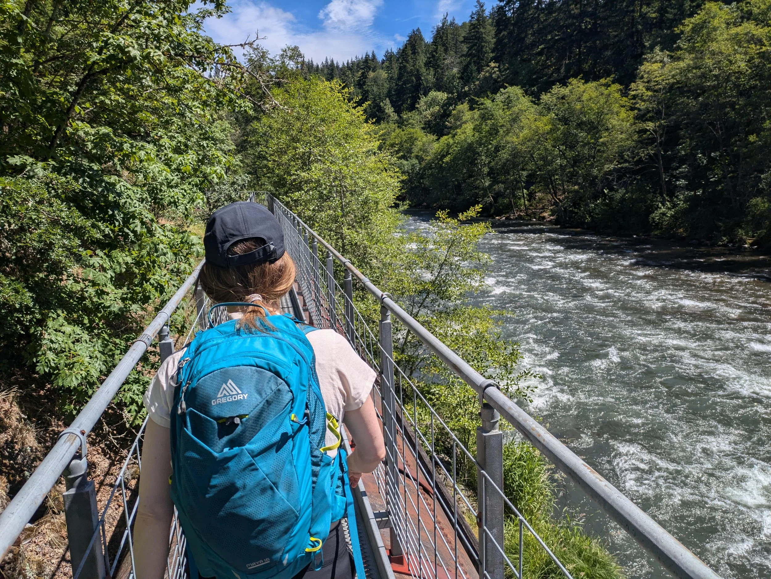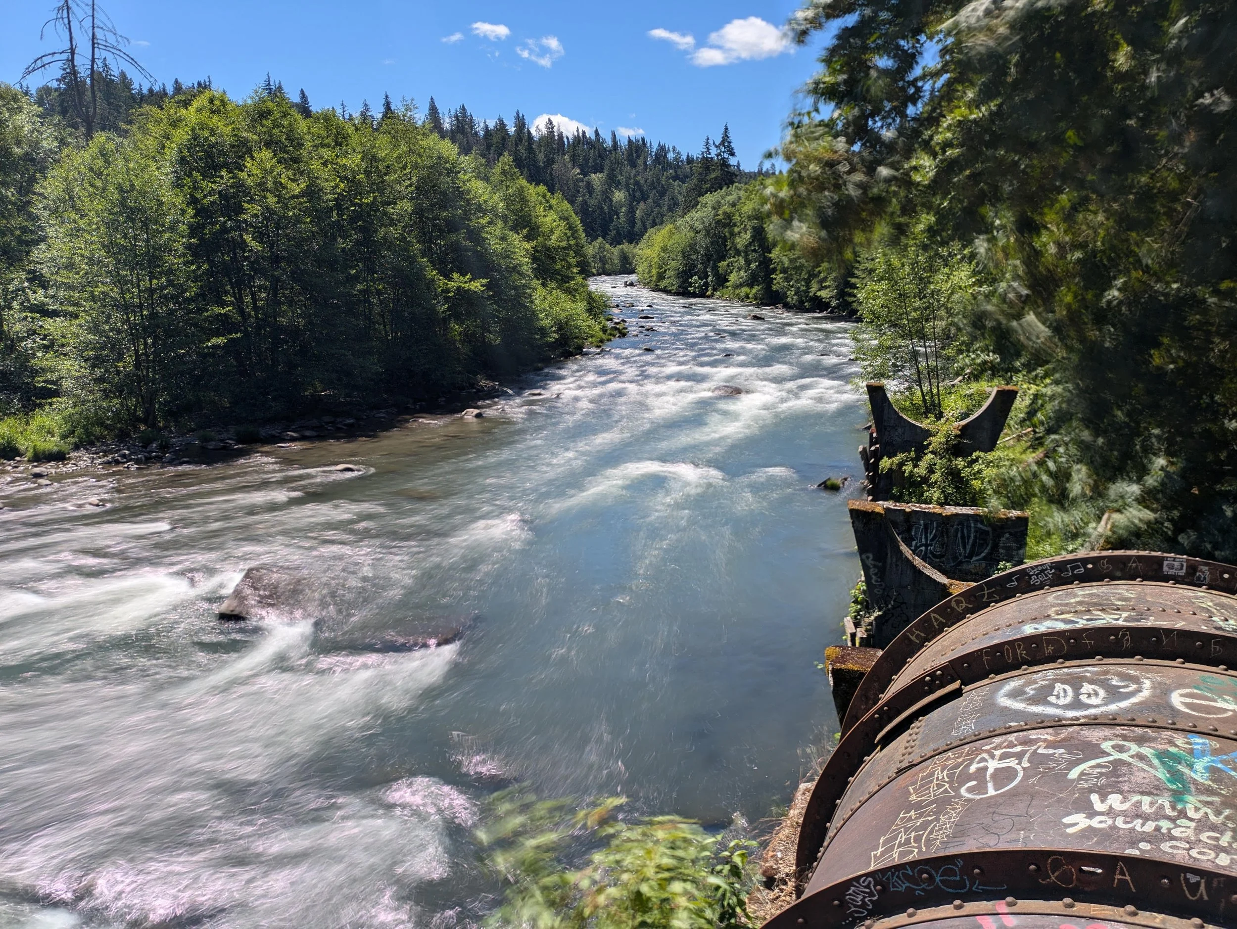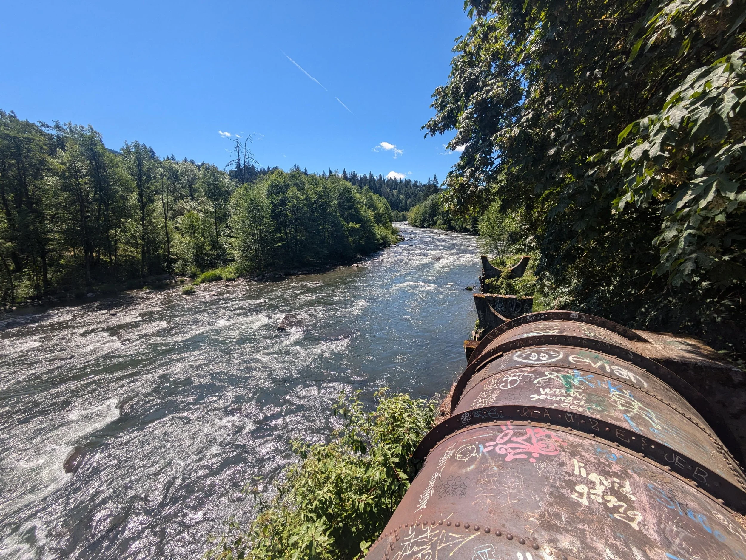 At 0.7 mile, look for a trail off to your right as the tracks bend off to the left. Follow this trail and arrive in short order at a huge metal bridge over the Hood River, which is so wide it momentarily splits into three channels. The bridge is where the pipeline begins, and is a lot of fun. Cross the bridge and on the far side, take a moment to walk down the ladder to a small beach on the river. What a cool spot! Climb back up the ladder, and follow the pipeline trail for 0.7 mile along a narrow bench above the river. The pipeline was once used to bring water downriver to a dam – and in the process, water would spray out from various spots along the pipeline. When floods in November 2006 tore out several sections of the pipeline, it ended the flow of water. Without a dam, the pipeline’s fate is cloudy. For now, keep going until you reach the end of the pipe at 1.4 miles from the trailhead. You can see here how the floodwaters tore out a large part of the bank, making it impossible to replace the pipe. This is a cool spot to hang out – you may even see people in rafts or kayaks, floating down the raging Hood River. Bring a book and some beer and hang out, if you please! Return the way you came.
