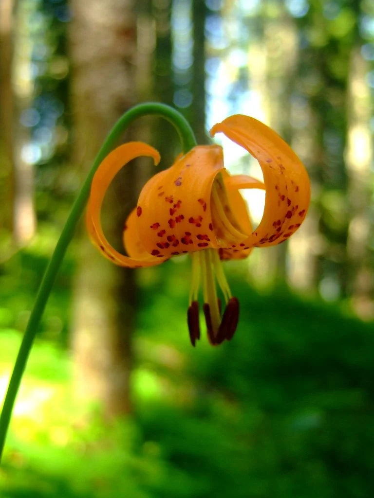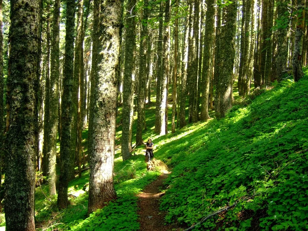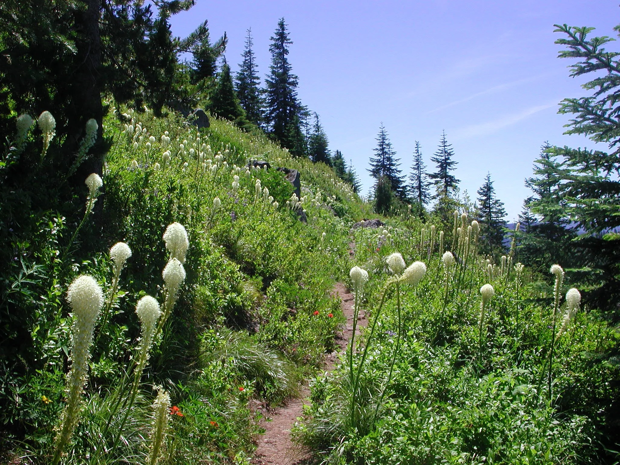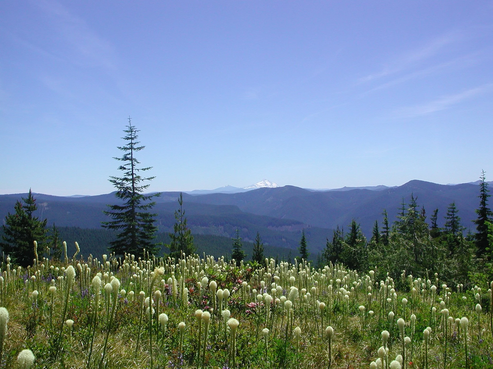Begin just outside the Riley Horse Camp. Locate the Horseshoe Ridge Trail, which leaves from a pullout on the road just before the horse camp Follow this trail for a sandy, flat mile to a crossing of Lost Creek in deep forest. The bridge here washed out in 2017, and the fording the creek is now difficult without getting wet. Once across the creek, the trail begins climbing almost immediately. Here it is time to strike up a conversation as you will be climbing for the rest of the way to your destination. After a mile of relatively gentle uphill from the bridge, reach the old trailhead at a pullout on a now-closed section of FR 380. Look for the continuation of the trail across the old road and continue climbing, entering the Mount Hood Wilderness Area just after crossing the road. On this switchbacking 3.4 mile ascent from the old trailhead to the summit, it is the little things that will grab your attention: orange tiger lilies in season, ferns and devil’s club in great quantities (stay on the trail!) and lichen-draped hemlocks and firs. Approximately half a mile from the top of the ridge, finally exit the forest and enter glorious wildflower meadows backed by a large talus slope. Look for more tiger lilies, large white and pink Cascade lilies, blue lupine, red paintbrush, and in some years, countless white beargrass plumes. Listen for the meep! of the pika, guardian of these slopes. Though you have already hiked 5 miles of uphill, keep going as the best is yet to come.