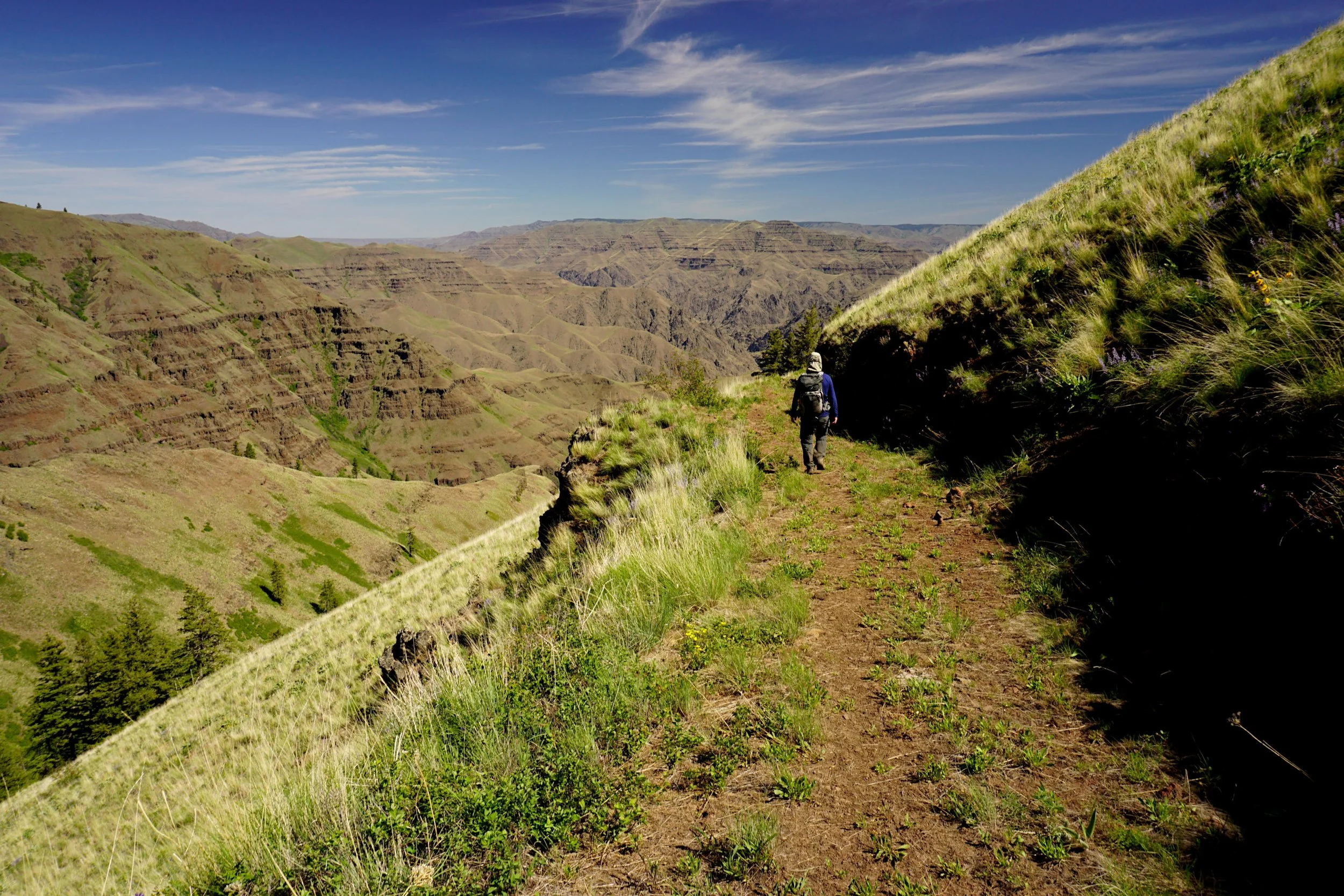 From the grassy trailhead, follow the road to a gate. Open the gate to walk through, and then close it behind you. The road descends through open forest for 0.6 mile to a junction at a saddle. Keep right to stay on the road, your route for the hike. The road continues its descent along open, steep slopes into the depths of Hells Canyon. Masses of wildflowers adorn these slopes in May and June; look for red and yellow paintbrush, lupine, phlox, larkspur, and so many more. Views open across the canyon to the Seven Devils Mountains in Idaho. At 2.1 miles, you’ll reach Spain Saddle. Here the road crosses from the south side of the ridge to the north side. Around the bend you’ll get your first view of the Snake River, as well as some of the last shade you’ll find on this hike. Take a few minutes to rest in the shade before continuing.