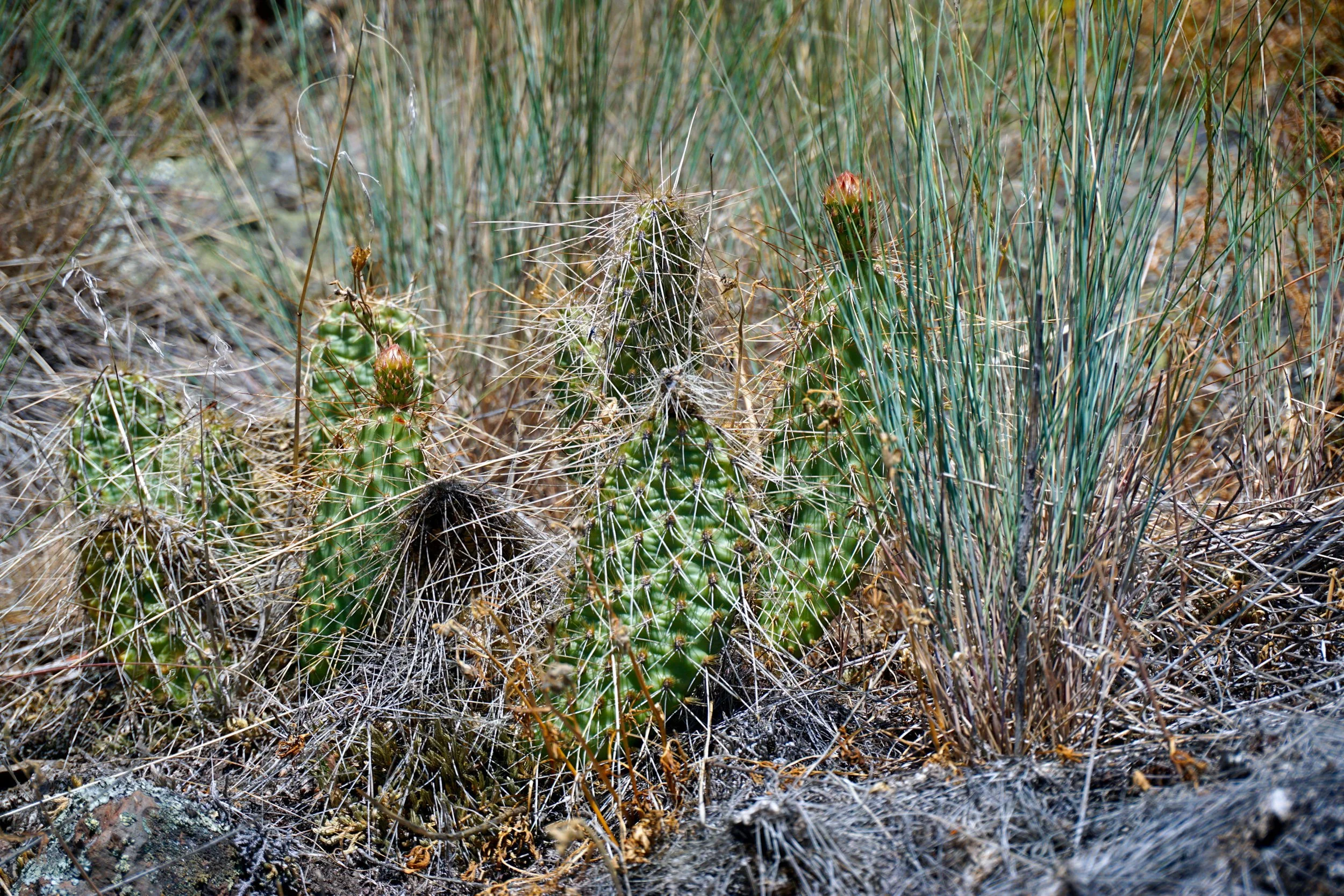Beyond Spain Saddle, the road continues downhill into the canyon, passing through another gate at 2.6 miles. From here, you’ll continue descending for another mile until you see some volcanic rocks on your left, just before the road curves to the right. Look here for a cairn and scramble up to the ridge top, which you will follow to its end. This promontory is known as the Eureka Viewpoint. From here, you can see the Snake River in three spots, still some 2,400 feet further down in the canyon. Keen eyes can pick out jet boats on the river below, and you will certainly hear them. Also keep an eye at your feet here, as prickly pear cactus grows on the slopes here, blooming in April and May.