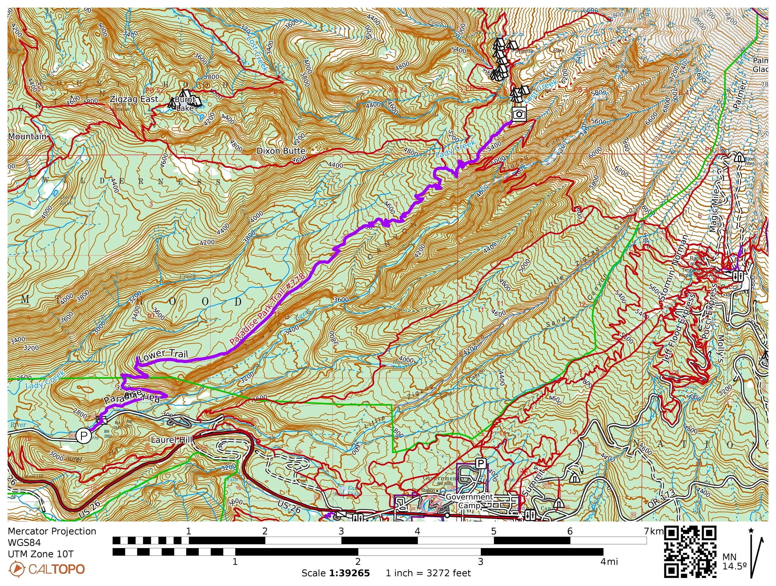 Begin at the trailhead with a short stretch of level trail through cool, mossy woods. Soon you will begin switchbacking uphill at a steady but never steep grade. There are few highlights; the one view is of the Zigzag River and out to US 26, which you can hear across the valley. Continue uphill through nice woods until you meet the East Zigzag Trail at 5.5 miles. Continue on the Paradise Park Trail another half-mile to a junction with the Timberline Trail / Pacific Crest Trail (they are the same trail here) at 6 miles. Continue straight on the Paradise Park Trail.