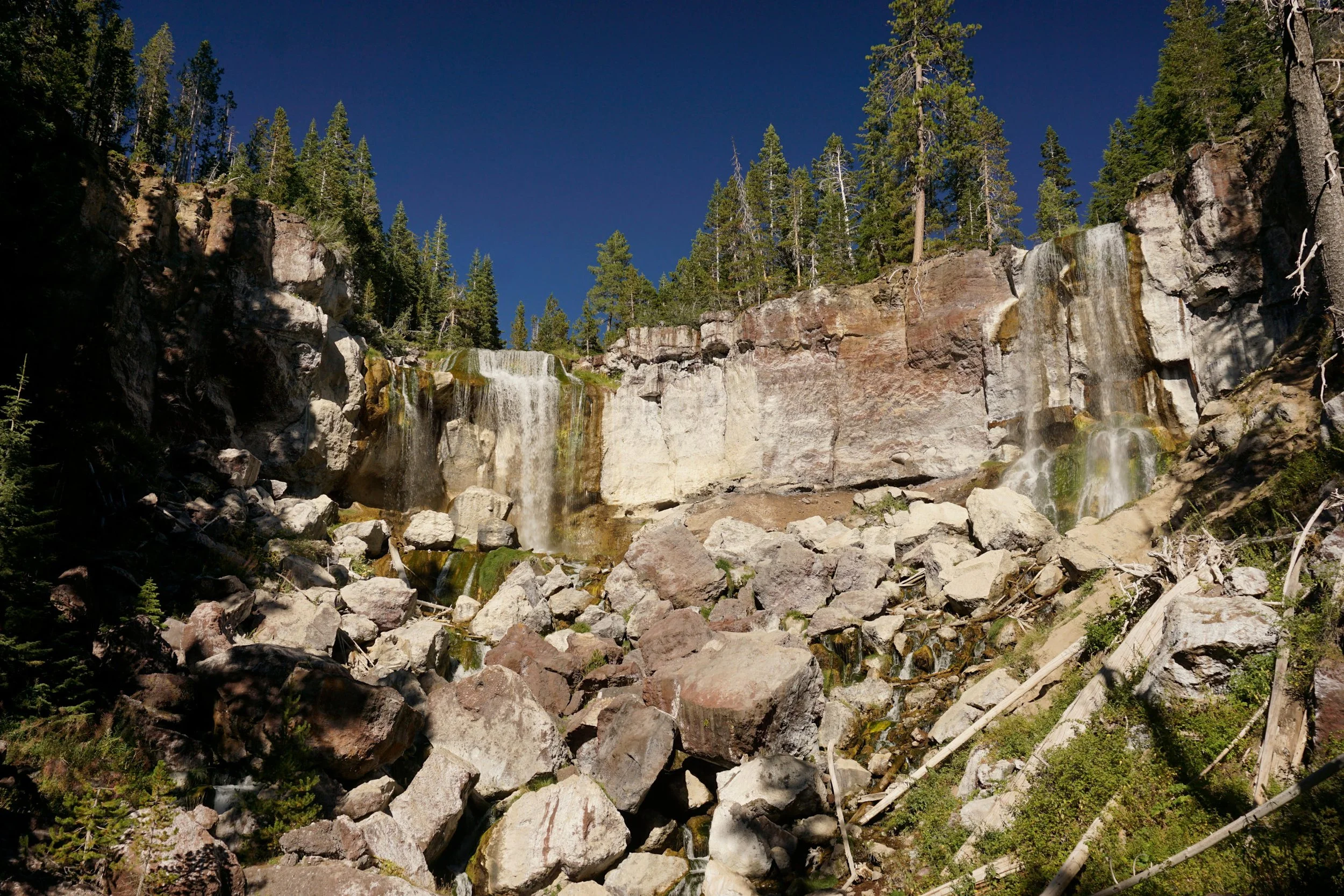 While you’re still here, there are three other fantastic side-trips well worth your time. Begin by driving a short distance downhill to the Paulina Falls parking lot. Here, one short trail leads to a view across the 80-foot double falls, while another drops 0.2 mile to a viewpoint at the base of the falls. After the falls, drive back to Paulina Lake, and locate the signed trailhead for Big Obsidian Flow. Here, you’ll hike a fun 0.8-mile trail through a massive obsidian flow that tumbled down from Paulina Peak’s crater just 1,300 years ago. At the top of this fun loop, you’ll have a view back across Paulina Lake to Mount Bachelor and South Sister. Watch where you put your hands; the obsidian is so sharp that you may cut your hands, as I mistakenly did here.